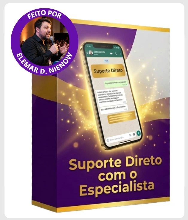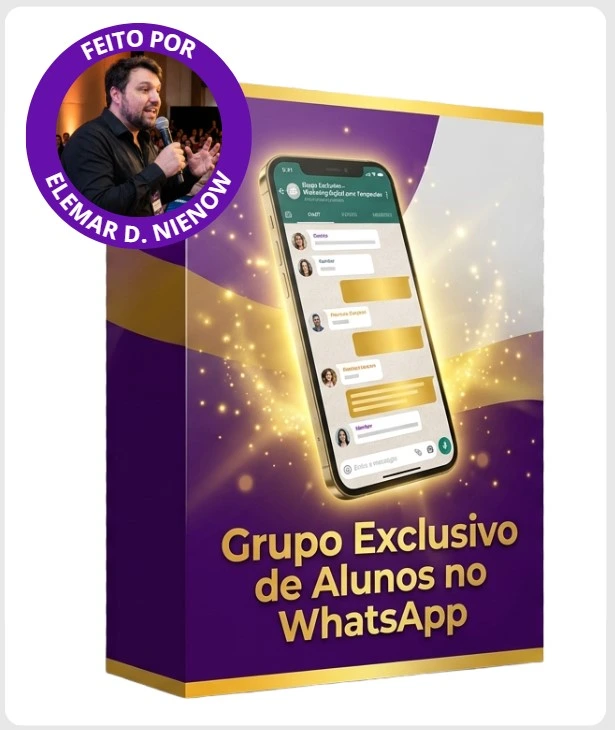 Acesso direto a mim (Elemar) via WhatsApp para tirar dúvidas sobre o conteúdo, estratégia ou implementação. Qualquer dificuldade que surgir, é só enviar mensagem que eu te respondo pessoalmente.